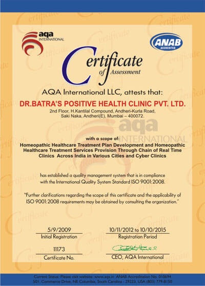 ISO 9001: 2008: Dr Batra's™ Positive Health Clinics branches in India have been granted the ISO 9001:2008 accreditation from the American Quality Assessors (AQA), currently the highest quality standards of their kind in the world. Dr Batra's™ is the world's first homeopathic healthcare corporate to achieve this distinction. This has especially been done to ensure the standardisation of treatment and care for our patients across the geographies where we are present.